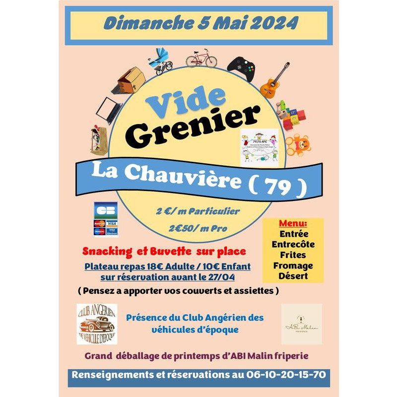 Venez vous faire plaisir au vide grenier de la chauviere ambiance conviviale. Profitez ainsi d un grand déballage de vêtements plus de 1000 pièces homme femme enfants à petits prix rien au dessus de 3 euros je vous attend avec grand plaisir à bientôt.