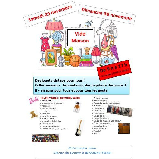 J'organise un vide maison où vous trouverez pleins de pépites de jouets vintages, de mobilier, de vaisselle, de vinyles, cd, dvd, cassettes vhs, livres, jeux de société, livres, matériel hi-fi, vidéo, photo, guitare électrique, etc...