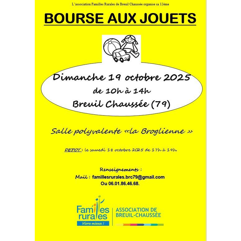 L'association familles rurales de breuil chaussée organise sa 12ème bourse aux jouets le dimanche 19 octobre 2025 à la salle polyvalente "la broglienne" de 10h à 14h00.