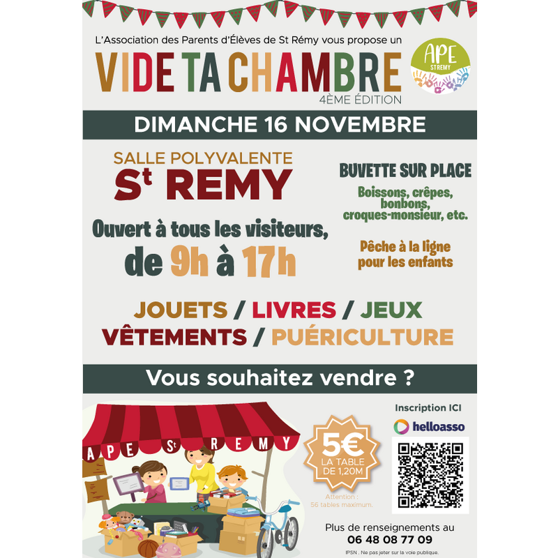 L’ape de st rémy (ecole maison de la plaine) vous propose une 4ème édition de son “vide ta chambre” le dimanche 16 novembre de 9h à 17h à la salle polyvalente de st rémy pour aider au financement des projets éducatifs de l’école.