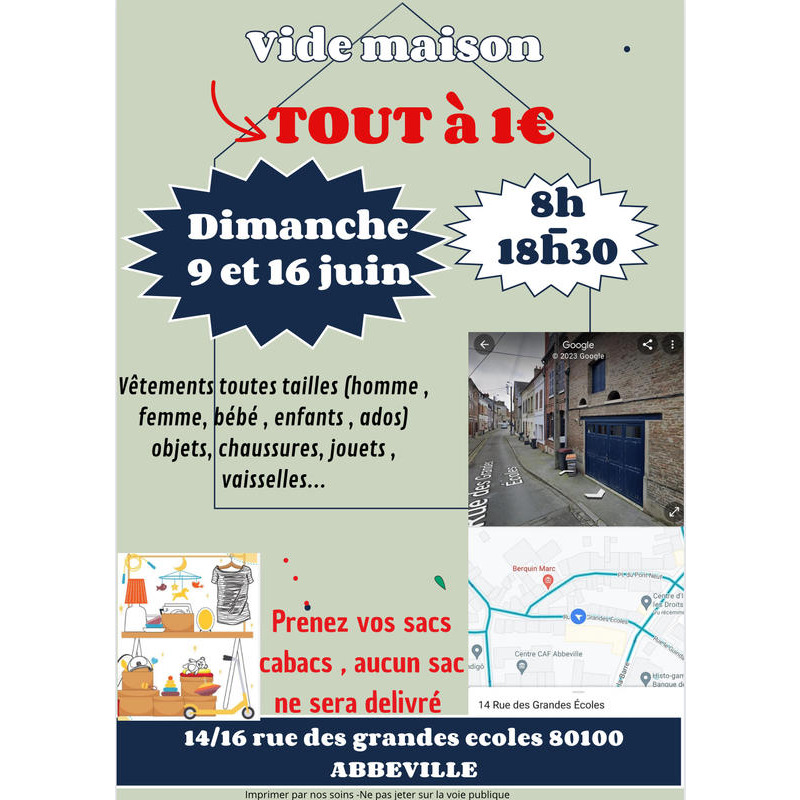 Tout a 1€ : vetements femmes (toutes tailles ) , hommes(toutes tailles) , enfants (toutes tailles) , bébé fille/garcon (toutes tailles) , chaussures (toutes tailles ) , bibelots , vaisselles , decorations .... - prevoir vos sacs cabac aucun sac ne sera delivré . Heure : 8h00 a 18h30