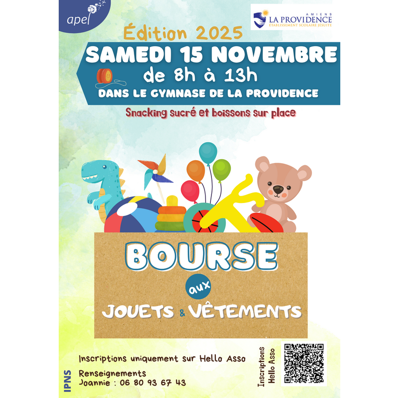 Pour la 4ème année consécutive, l'apel organise la bourse aux jouets et vêtements de la providence... Elle se déroulera le samedi 15 novembre de 8h à 13h dans le gymnase de l'établissement