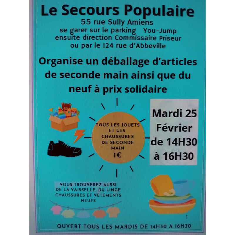 Destockage jouets et chaussures de seconde main 1€ vous trouverez aussi des vêtements neufs et de seconde main. Du linge, de la vaisselle de seconde main et du neufs. Des chaussures neuves de 2 à 10€ ouvert à tous.