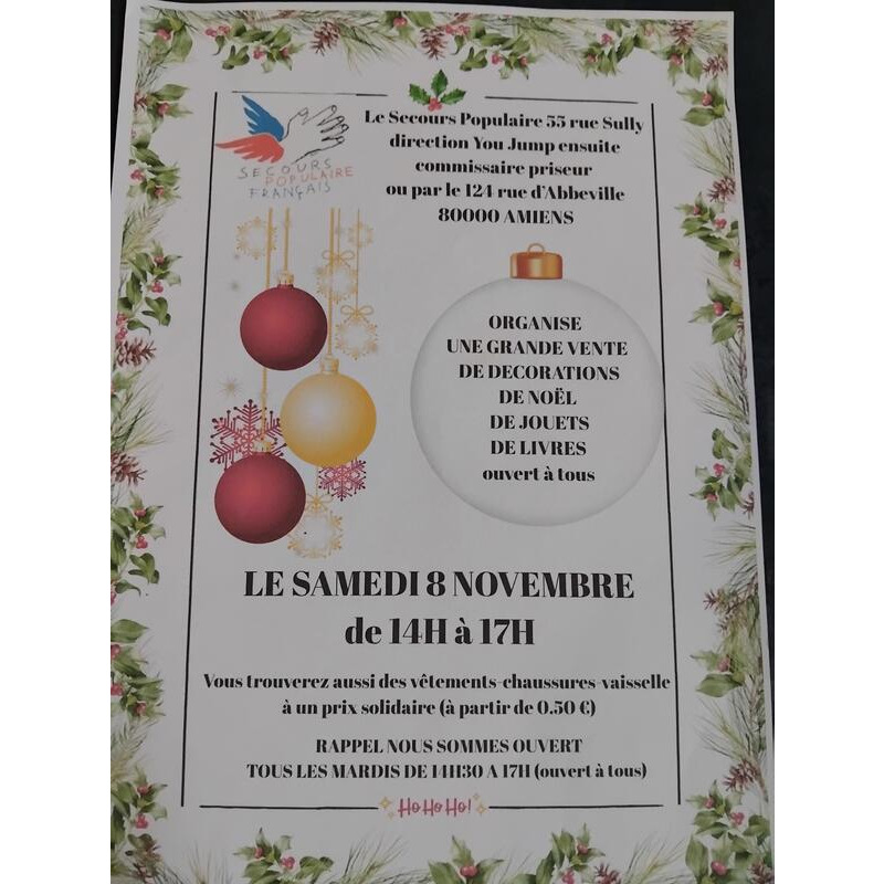 Le samedi 8 novembre de 14h à 17h le secours populaire 55 rue sully à amiens organise une grande vente de décorations de noël, de livres,de jouets,vêtements etc à prix solidaires ouvert à tous