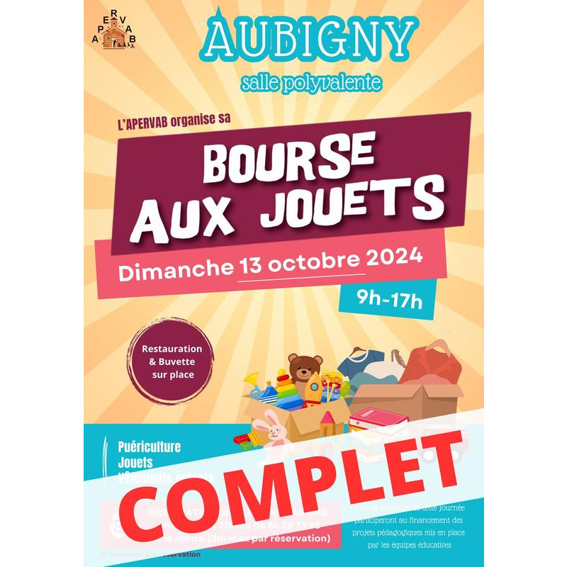 On vous donne rendez-vous le dimanche 13 octobre 2024 à la salle polyvalente d'aubigny pour la traditionnelle bourse aux jouets, au profit des enfants du rpi