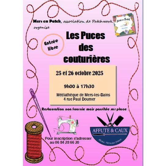 Puces des couturières organisées par l'association de patchwork de mers-les-bains intitulée "mers en patch" (vente de mercerie, laine, tissus.M, dentelles...) un rémouleur se joindra aux puces pour aiguiser couteaux, ciseaux...