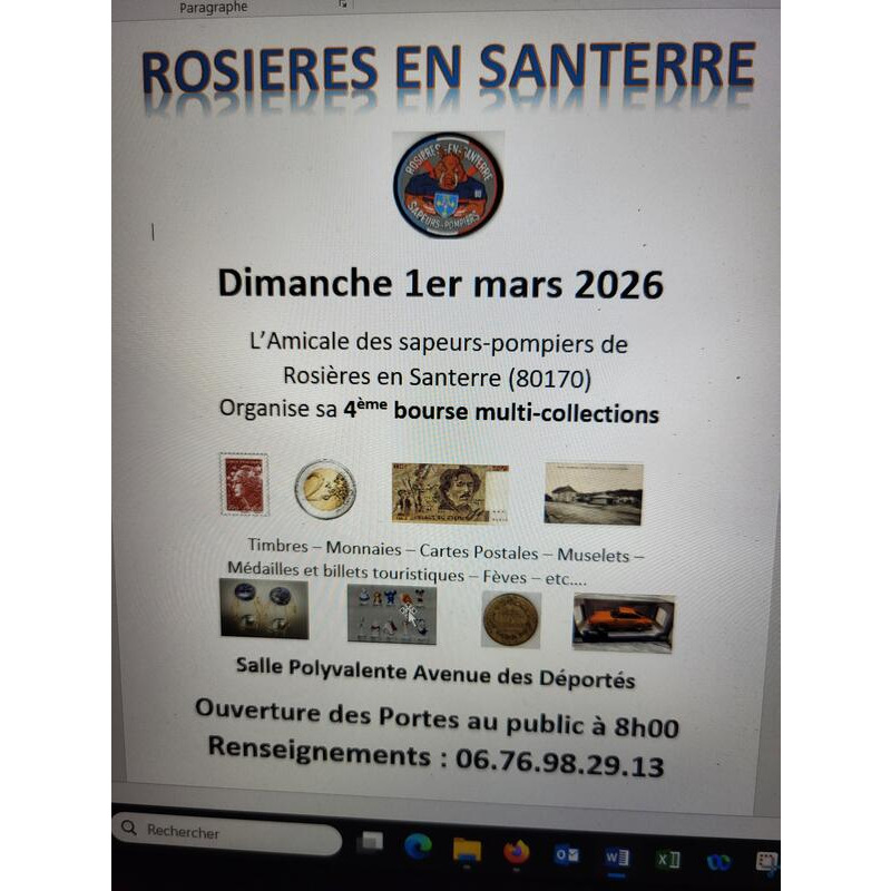 L'amicale des sapeurs-pompiers de rosières en santerre organise sa 4ème bourse multi-collections le dimanche 1er mars 2026, à la salle polyvalente, avenue des déportés. Ouverture public à 8h00. Entrée gratuite. Restauration et buvette.