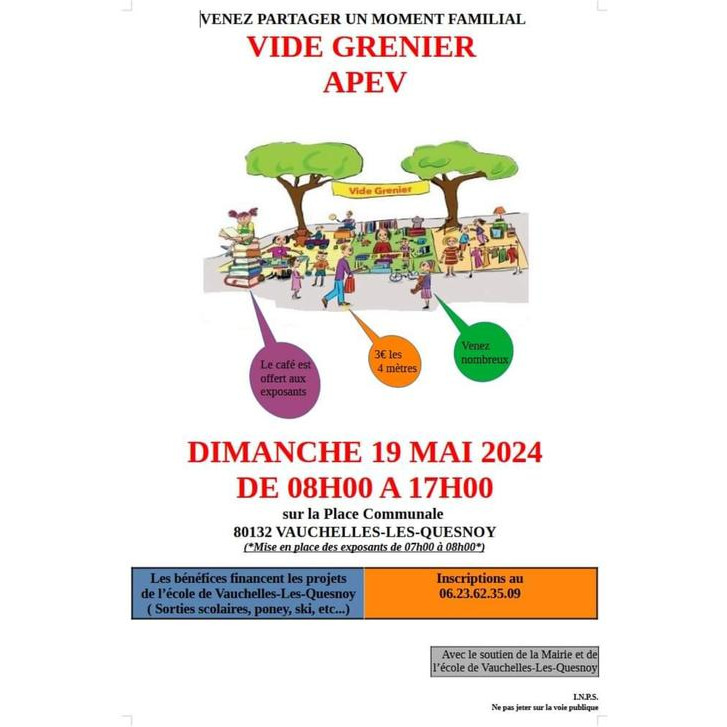 Comme chaque année, l'apev de vauchelles-les-quesnoy organise son vide grenier le 19 mai 2024 sur la place communale.
