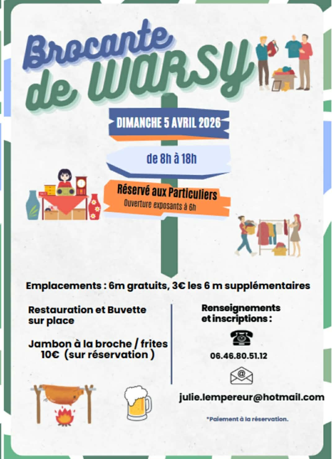 6 Mètres gratuits, 3 € par tranche de 6 mètres supplémentaires, Paiement à la réservation à l’ordre du Comité des Fêtes de Warsy (pas de remboursement).