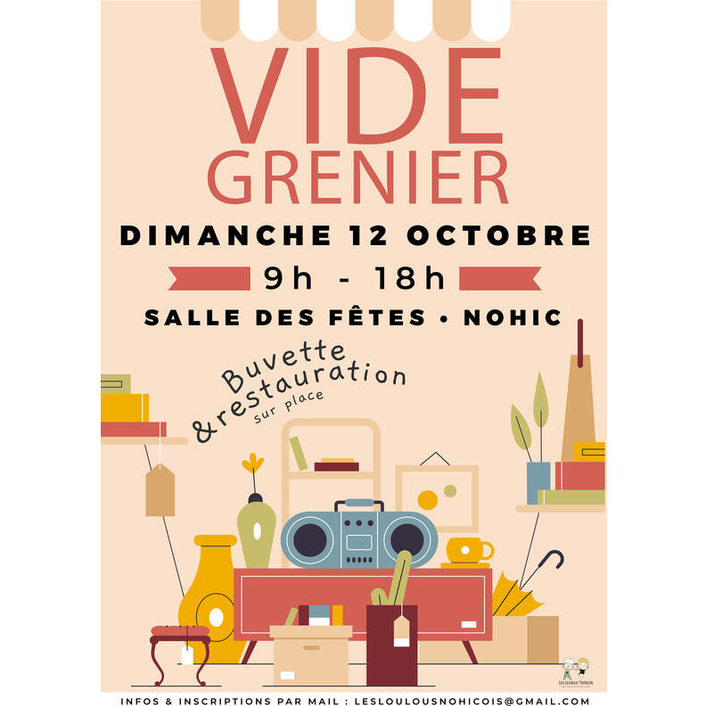 Vide grenier vous en avez marre de garder des vêtements qui ne vous vont plus ? Des jouets des enfants auxquels ils ne jouent plus et qui prennent la poussière ? Des objets déco que vous n'aimez plus ? Ça tombe bien ! Samedi 27 septembre, nous organisons notre vide grenier. Où ça ? Dans la salle des fêtes de nohic, la rue de la poste et la place boris vian.