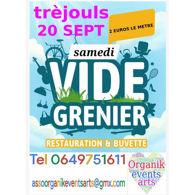 Vide grenier organisé par l'association organik évents arts sur le parking de la salle des fêtes buvette et restauration sur place.