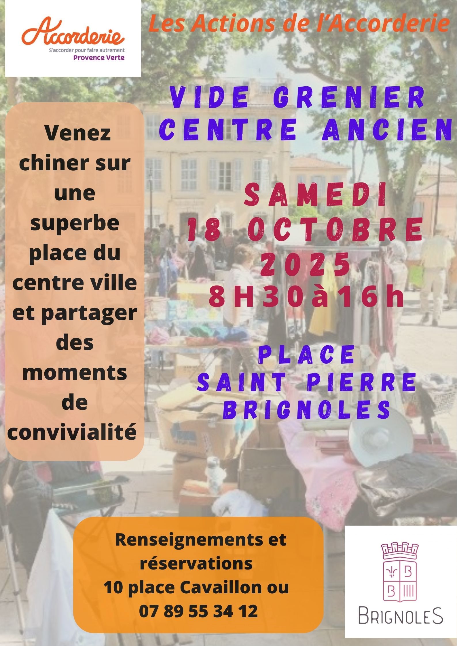 Vide grenier du centre ville de Brignoles, Place St Pierre, près de 50 exposants sur une place bordée de platanes, le Samedi 18 octobre 2025. Organisé par l'Accorderie Provence Verte