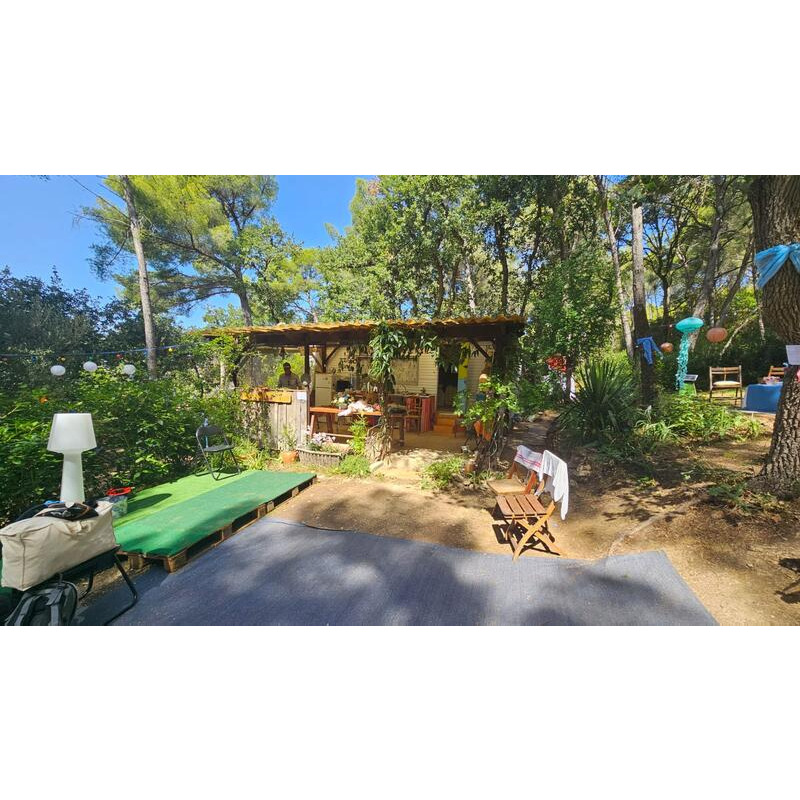 Sur le terrain de mon cabanon, avec mes amis, nous faisons un jolie vide maison avec divers objets, tables, chaises, assiettes et vêtements