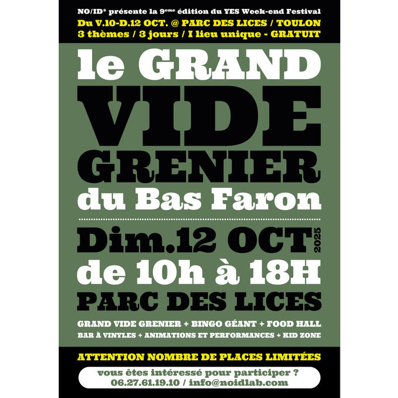 Un grand vide grenier se tiendra de 10h à 18h sur le parc des lices dimanche 12 octobre à l'occasion de la 9ème édition du festival yes week-end#9. .Venez chiner tout en appréciant les autres propositions présentes sur le lieu : foodtrucks & bars, loto à 15h , châteaux gonflables , grands jeux en bois pour petits et grands en libre accès, petite sélection de stands de créateurs locaux, dj set .... Evènement festival yes week end : https://fb.me/e/6q7DDu0da . Pour des informations complémentaires : parking gratuit à proximité, buvette & restauration sur place, entrée gratuite. Yes week-end festival est une production no/id* mail de contact : .Nos principaux réseaux sociaux : page facebook : @noidlabtoulon / page instagram : @noidlab www.yeswknd.fr