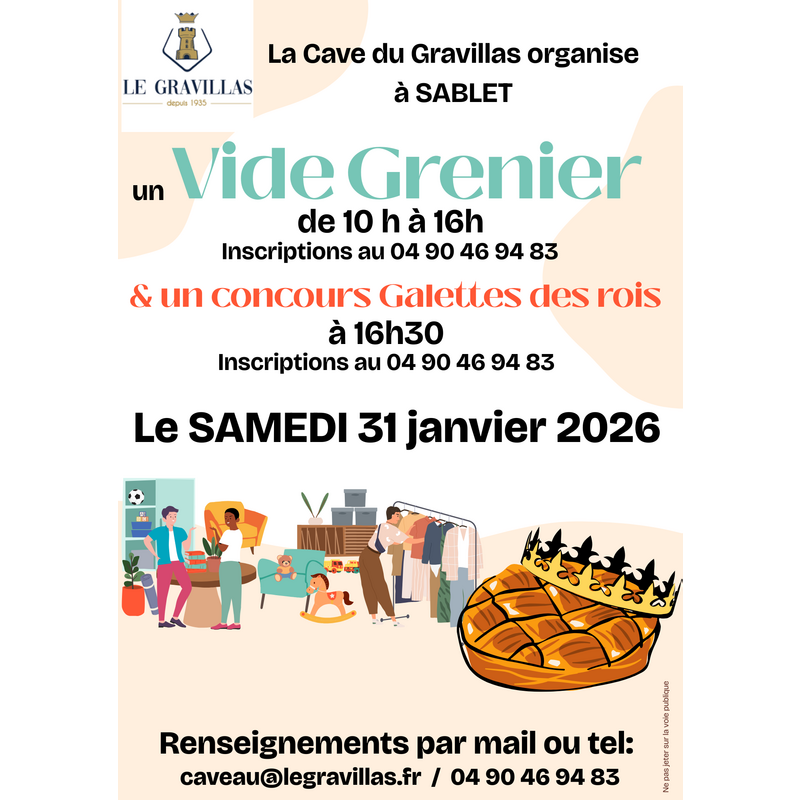 Rejoignez-nous le samedi 31 janvier 2026 à la cave le gravillas à sablet pour une journée conviviale et gourmande ! De 10h à 16h, participez à notre vide-grenier pour vendre, acheter ou échanger vos trésors, ou inscrivez-vous au concours de galette des rois pour tenter de décrocher le titre de roi ou reine de la galette. Les meilleures galettes seront récompensées par de bouteilles de vin, et votre emplacement au vide-grenier est gratuit si vous participez au concours. Un moment familial, festif et chaleureux à ne pas manquer pour débuter 2026 sous le signe du partage et de la gourmandise !