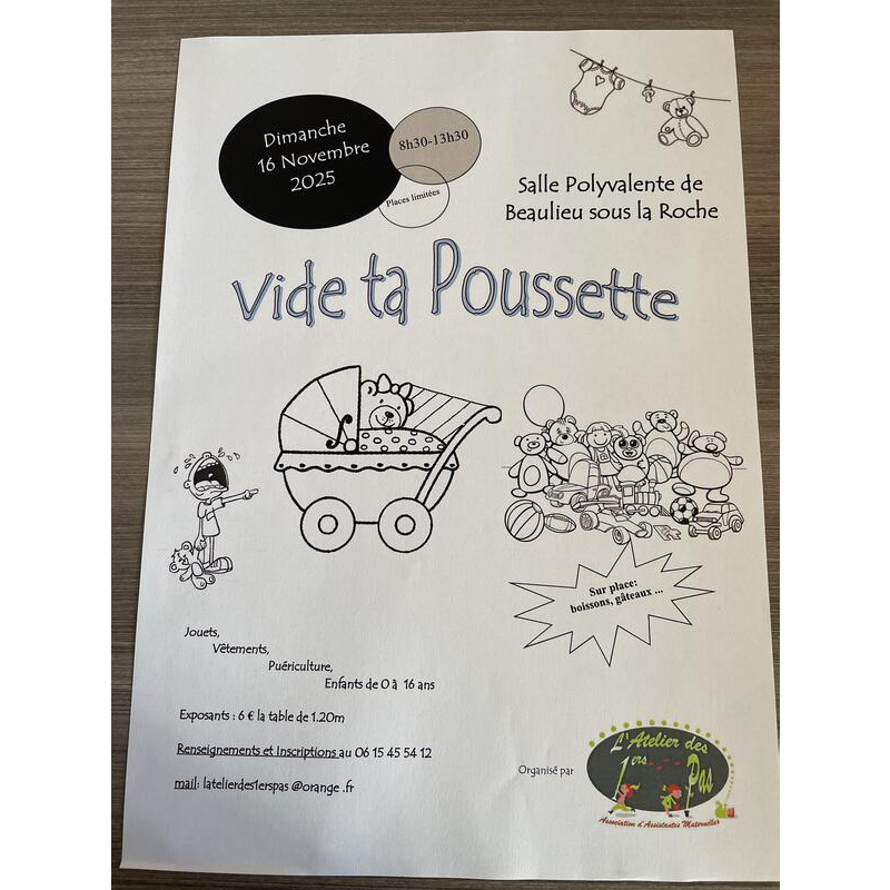 L’ association d’assistante maternelle organise le dimanche 16 novembre 2025 à la salle polyvalente de beaulieu sous la roche un vide ta poussette de 8h30 à 13h30. Vente de jouets, vêtements et matériel de puériculture. Venez nombreux avec ou sans poussette !