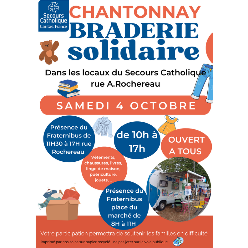 Vêtements, chaussures, livres, linge de maison, jouets... De seconde main pour un geste solidaire et écoresponsable ! Les bénéfices permettent de soutenir les familles en difficultés accompagnées par l'association caritative.