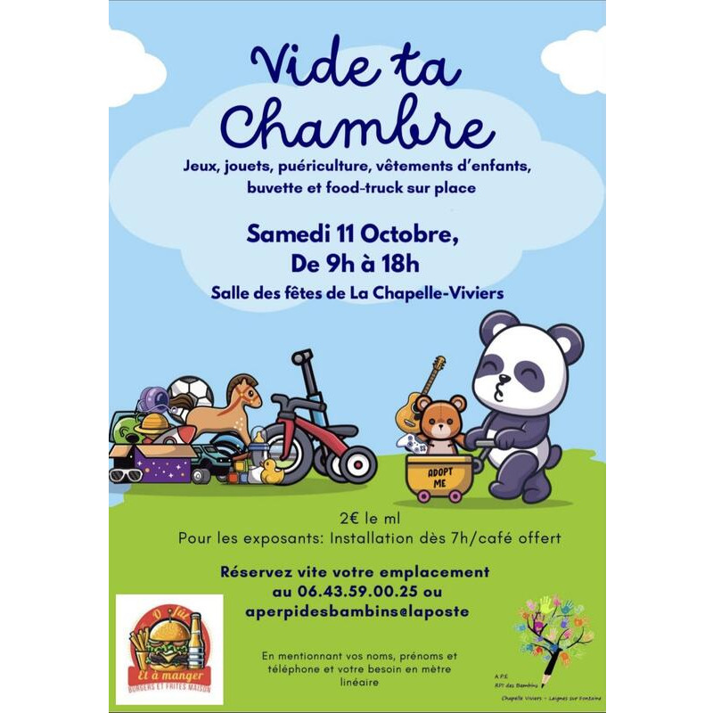 Rendez-vous le samedi 11 octobre 2025, de 9h à 18h, pour notre vide ta chambre organisé par l'ape du rpi de la chapelle-viviers et leignes sur fontaine ! Venez chiner, vendre, acheter et donner une seconde vie aux affaires de vos enfants (jeux, jouets, puériculture, vêtements d'enfants) ! Tarif emplacement: 2€/ml buvette et food truck sur place