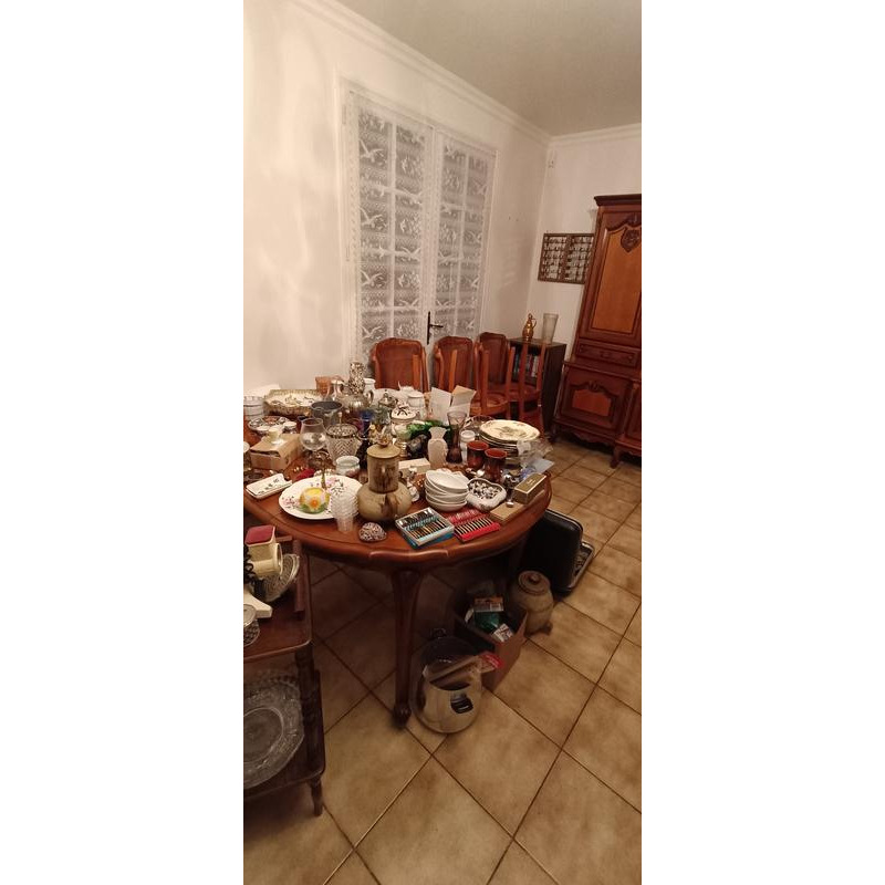 Vide maison, mobilier merisier salle à manger, armoires, tapis, décorations ethniques, divers collections (ricard, fèves...), verre cristal, meuble télé...