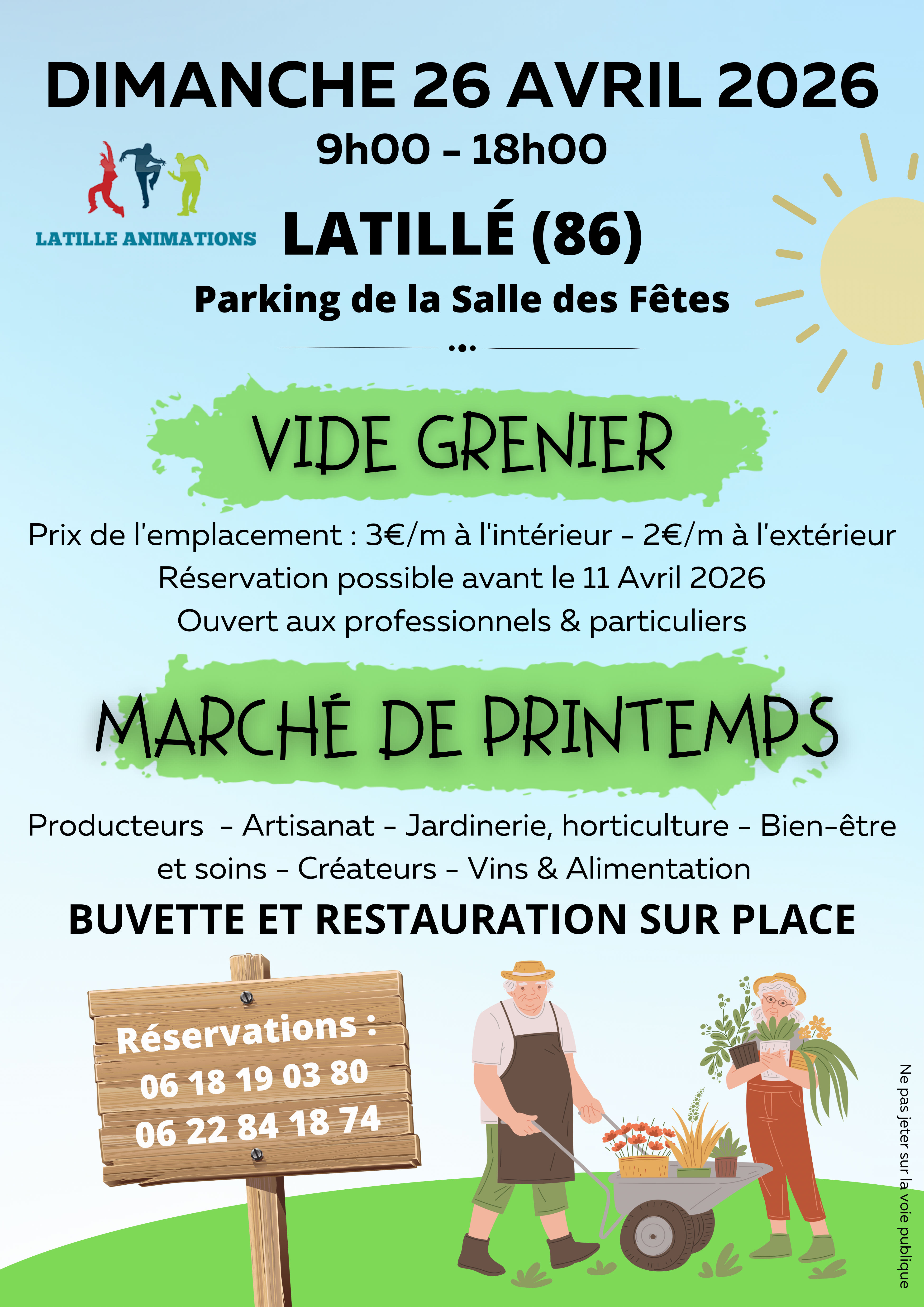 Les réservations sont ouvertes jusqu'au 11 avril inclus. Toute réservation devra être confirmée par l'envoi du bulletin d'inscription et de l'attestation joints, accompagnés de préférence d'un chèque à l'ordre de « Latillé Animations ».