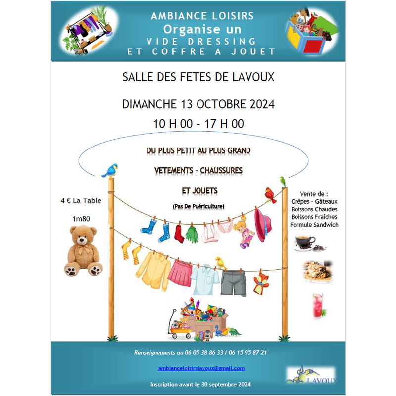 L’association ambiance loisirs lavoux organise un vide dressing et coffre à jouet. Salle des fêtes de lavoux le dimanche 13 octobre de 10h à 17h.