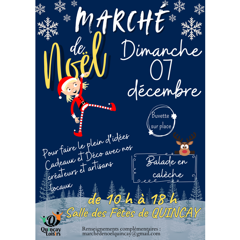 L’édition 2025 du marché de noël organisé par quincay loisirs se déroulera le dimanche 07 décembre de 10 h à 18 h dans la salle des fêtes de quincay.
