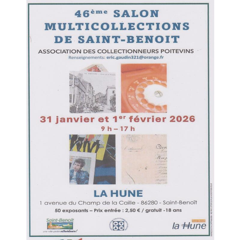 Salon multi collections 46 ème année de 9h à 17h couvert, salle chauffée, toilettes, accès handicapés, expositions, buvette, exposants en alimentaire refusés, entrée 2,50 euros, association des collectionneurs poitevins. 1 avenue du champ de la caille- salle de la hune- renseignements : . Samedi 31 janvier et dimanche 1er février 2026 de 9h00 à 17h00, 50 exposants, (cartes postales, numismatique, médailles, jetons, billets, télécartes, livres anciens, vieux papiers, journaux, parfums, pin’s, pokémon, jouets divers, bd ? Auto et camions miniatures, poupées, belle brocante, pub documents, objets divers, affiches, etc…. (négociants professionnels et membres de l’association) expositions divers des membres de acp.
