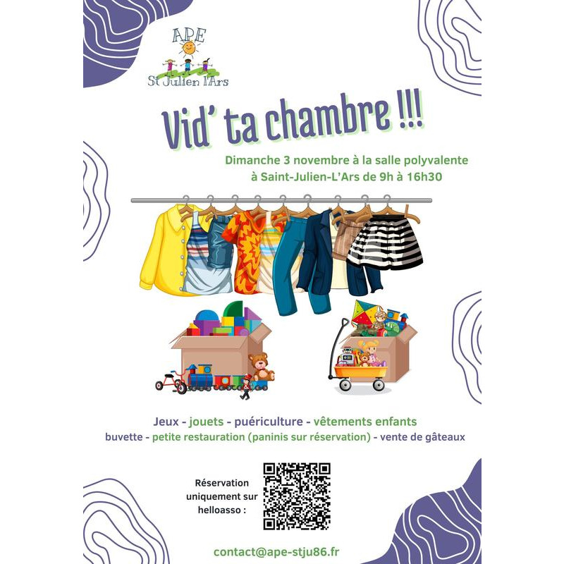Le traditionnel vid'ta chambre de l'ape aura lieu le dimanche 3 novembre 2024 de 9h à 16h30 à la salle polyvalente de st julien l'ars. Une quarantaine d'exposants propose, à l'abri dans la salle, des livres, jeux, jouets ainsi que vêtements/chaussures pour enfants et articles de puériculture.