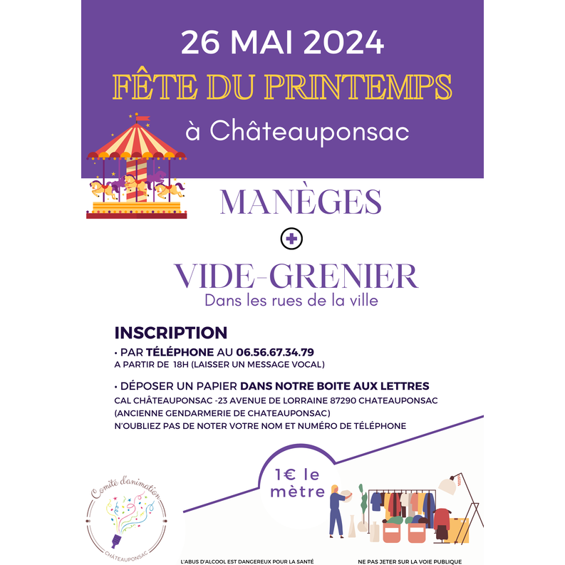 Vous cherchez un plan sympa pour la fête des mères ? Ne cherchez plus ! Rejoignez-nous le dimanche 26 mai pour notre fête du printemps à châteauponsac. Au programme : un vide-grenier pour dénicher des trésors, quelques manèges pour le plaisir des petits et des grands, et bien sûr, une journée pleine de convivialité et de bonne humeur. Restauration et buvette sur place pour régaler vos papilles. Venez nombreux passer une journée inoubliable avec nous !