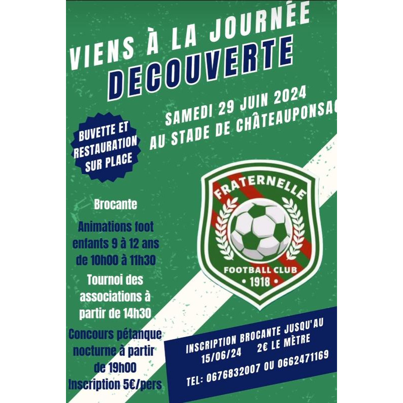 Tout au long de la journée du 29 juin 2024 le club us fraternelle football club de châteauponsac organise une journée découverte avec le matin une initiation au foot pour les enfants de 9 à 12 ans, un tournoi des associations l'après midi et le soir une pétanque nocturne ainsi qu'une brocante sur toute la journée.