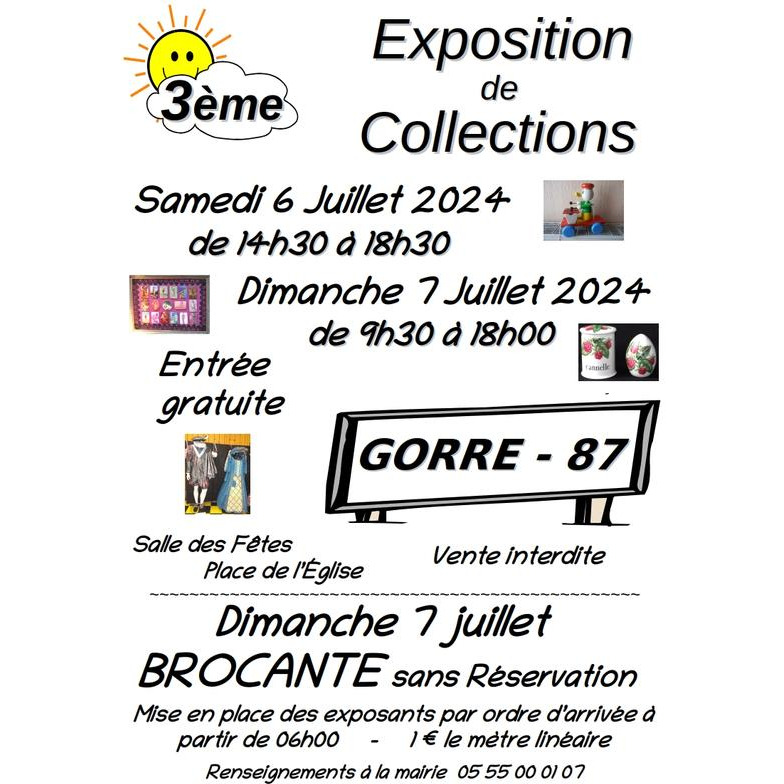 le samedi 6 juillet de 14h30 à 18h30 et le dimanche 7 juillet 2024 de 9h30 à 18h00 dans la salle des fêtes, située place de l'église, se déroulera le 3ème salon des collectionneurs de gorre en haute-vienne.