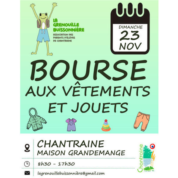 Traditionnelle bourse aux vêtements enfants, jeux, jouets et matériel de puériculture organisée par la grenouille buissonnière, association des parents d'élèves des écoles de chantraine.