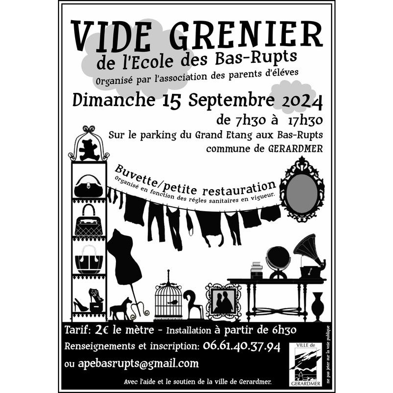 Le vide grenier annuel de l'école des bas rupts se déroulera le 15 septembre 2024 au parking du grand étang au bas rupts (gérardmer).