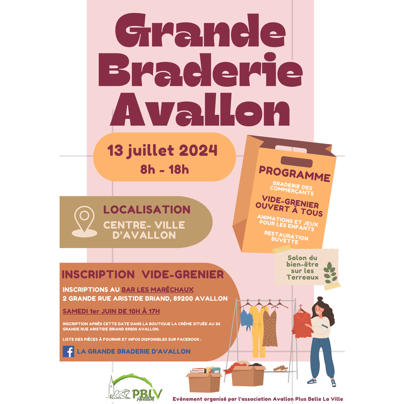 Le plus grand évènement populaire et estival du centre-ville d'avallon, réunissant braderie des commerçants et vide-grenier ouvert à tous, est de retour pour une édition 2024 organisée le samedi 13 juillet par l'association avallon plus belle la ville.