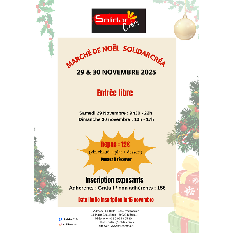 L'association solidarcréa a le plaisir de vous convier à son chaleureux et festif marché de noël 2025 ! Venez partager un moment convivial, dénicher des trésors et savourer l'esprit des fêtes.