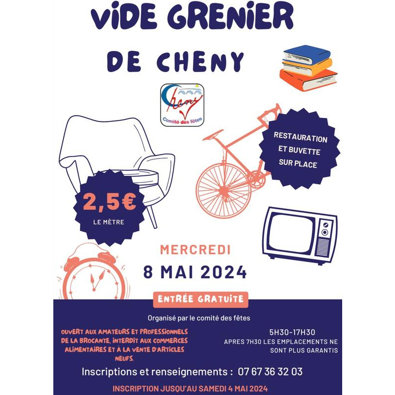 Vide grenier organisé par le comité des fêtes de cheny dans le centre ville. Restauration sur place. Parking à proximité.