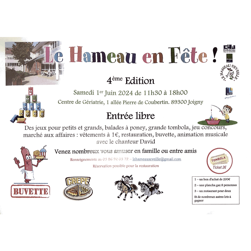 1 espace marché aux affaires (vêtements, articles de décoration, jouets ....) à bas prix 1 euros pour la plupart dont le fruit de la vente est destinée à une association hameau s'éveille; il y aura des jeux pour petits et grands, balades à poney, grande tombola (bon d'achat de 200 euros, une plancha gaz pour 8 personnes, un restaurant pour 2 personnes...), restauration, buvette.....