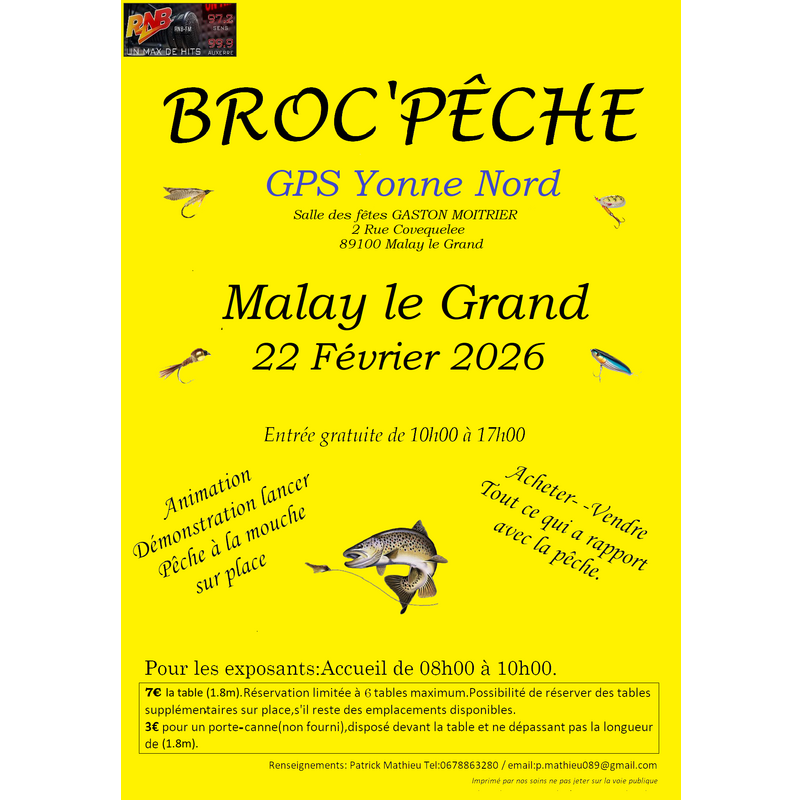 Acheter vendre, échanger, tout ce qui a rapport à la pêche. Nous prévoyons également des démonstration de lancer de pêche à la mouche.