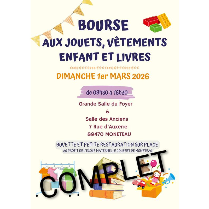 3ème bourse aux jouets, jeux, vêtements enfants et livres organisée par l'ecole maternelle colbert de monéteau.