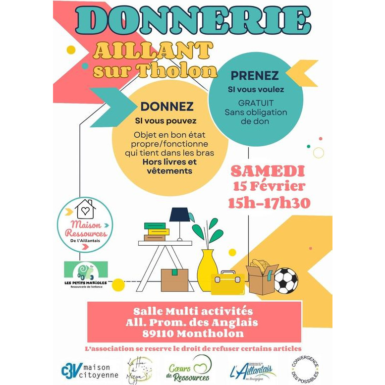 Les donneries de la maison ressources de l aillantais sont des espaces de gratuité, ou vous pouvez au choix, deposer des articles (en bon etat qui tiennent dans les bras), et/ou en prendre gratuitement.