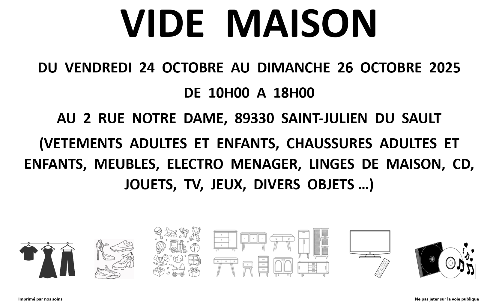 Vide maison (vêtements adultes et enfants, chaussures adultes et enfants, linges de maison, meubles, électro ménager, jouets, cd, dvd, tv, jeux, divers objets à tous petit prix)