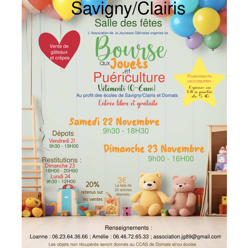 L’association de la jeunesse gâtinaise organise sa bourse aux jouets, vêtements (0 à 6 ans) et articles de puériculture à la salle des fêtes de savigny-sur-clairis. Dates et horaires : • dépôt des articles : vendredi 21 novembre de 9h30 à 19h • vente : • samedi 22 novembre de 9h30 à 18h30 • dimanche 23 novembre de 9h à 16h • restitution des invendus : • dimanche 23 novembre de 18h à 20h • ou lundi 24 novembre de 9h30 à 12h articles acceptés : jouets, livres, matériel de puériculture, vêtements et chaussures enfants jusqu’à 6 ans ou pointure jusqu’à 30. Modalités de dépôt : • liste de 1 à 25 articles • frais de dépôt : 3 € par liste • 20 % retenus sur le montant des ventes petite restauration sur place : boissons chaudes, gâteaux et crêpes maison tout le week-end ! Venez vendre, chiner et passer un moment convivial en famille salle des fêtes de savigny-sur-clairis (89) nous restons joignable par téléphone ou par mail