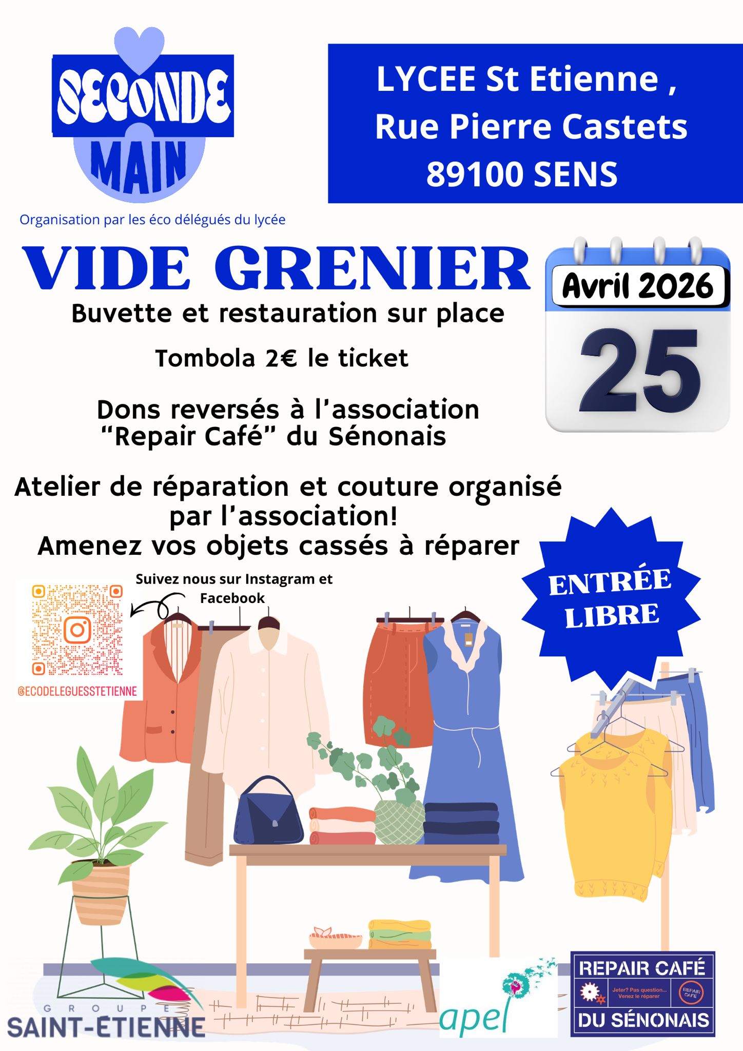 Le samedi 25 avril 2026, venez vivre une journée pleine de bonne humeur, de rencontres et de belles trouvailles. Le printemps s’installe, c’est le moment idéal pour vider vos placards, faire de bonnes affaires et profiter d’une ambiance conviviale avec buvette, sandwichs, snacks, barbe à papa, tombola et animations. Le Lycée Saint-Etienne vous ouvre ses portes, face à la clinique Paul Piquet. Réservez votre emplacement et rejoignez‑nous pour cette fête ouverte à tous !