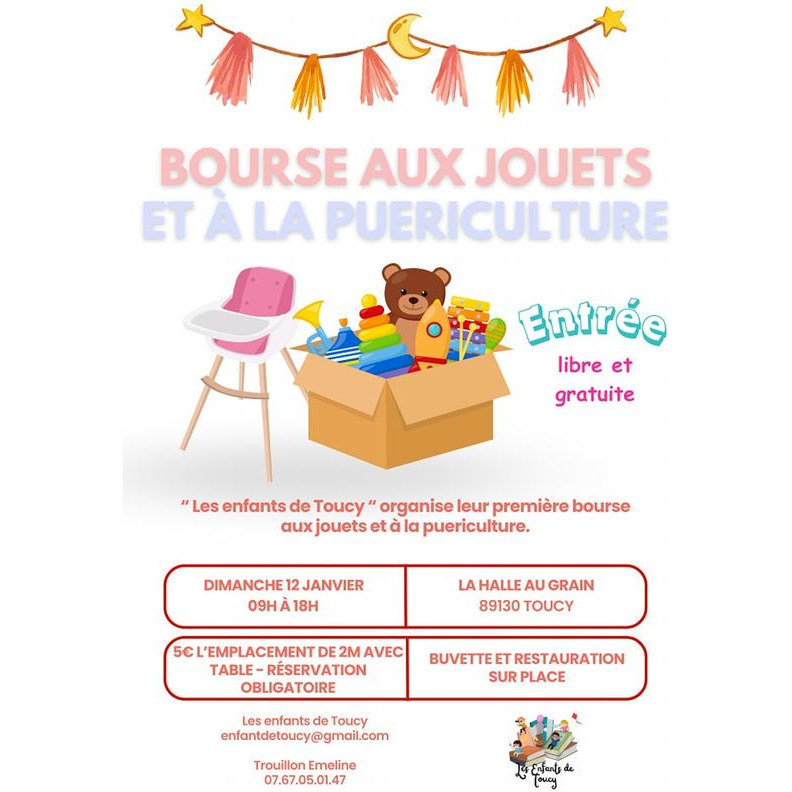 L'association "les enfants de toucy" organise leur première bourse aux jouets et à la puériculture, entrée libre et gratuite. Plus d'une quinzaine d'exposants seront en place, buvette et restauration sur place.