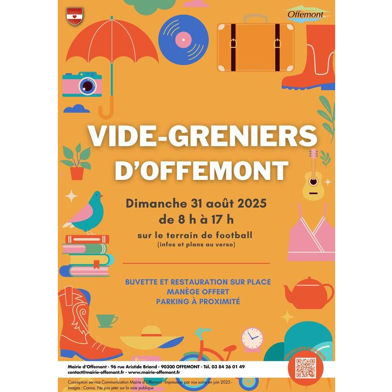 Envie de chiner, de faire de bonnes affaires ou de vider vos placards ? Ne manquez pas le grand vide-greniers d’offemont, sur le terrain de football ! Pour les visiteurs : entrée gratuite, parking à proximité, restauration sur place, buvette, manège offert pour les enfants et ambiance assurée toute la journée ! Inscriptions en mairie avant le 27 août.