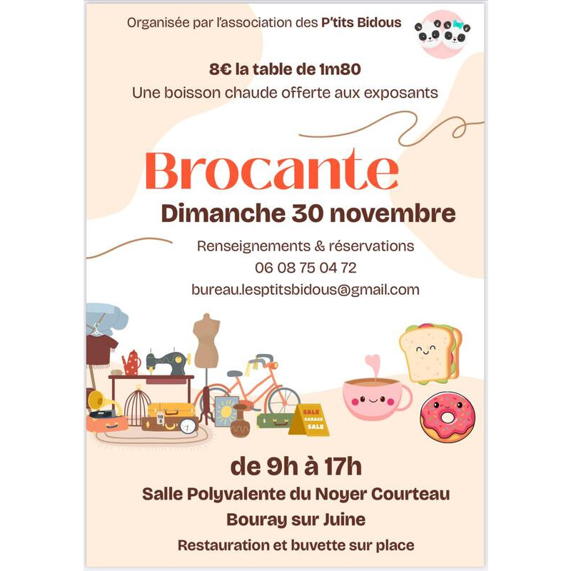 Venez chiner dans une ambiance conviviale lors de la brocante organisée par l'association les p’tits bidous, crèche parentale à bouray-sur-juine, le dimanche 30 novembre 2025 !