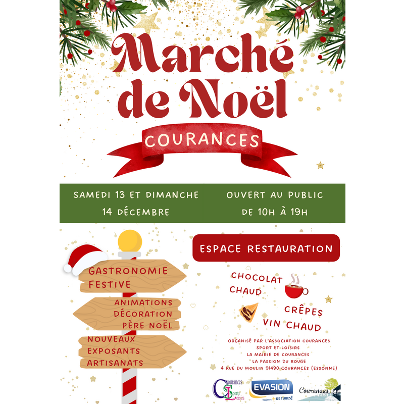 Marché de noël à courances : artisanat, gastronomie, décorations, présence du père noël, restauration sur place avec chocolat chaud, crêpes et vin chaud dans une ambiance festive et chaleureuse.