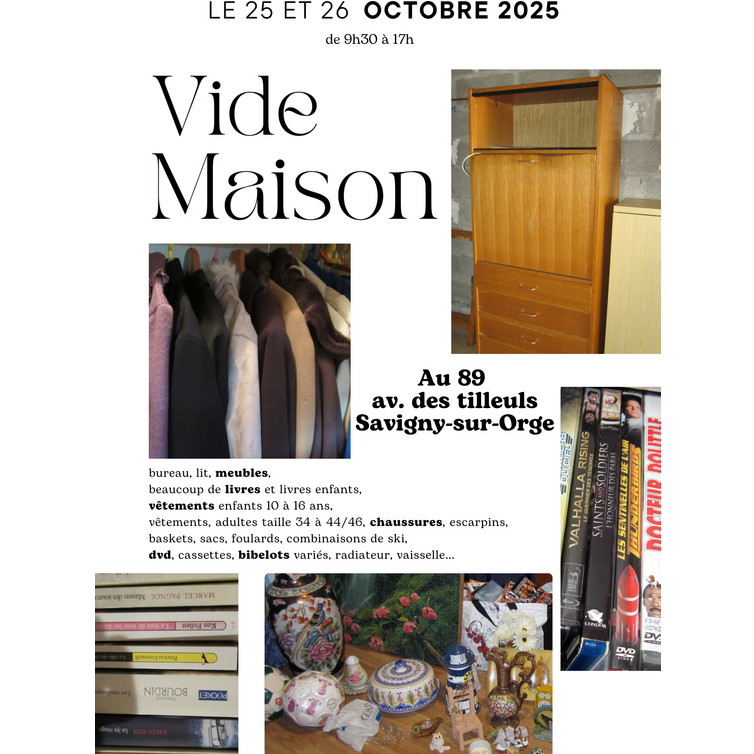 Meubles (chaise, bureau, table de salon, bureau, lit et chevet...), vaisselle, livres, dvd, vêtements taille 10 ans à 16 ans, taille 34 à 46, été hiver, combinaison, manteaux, bibelots, jouets...