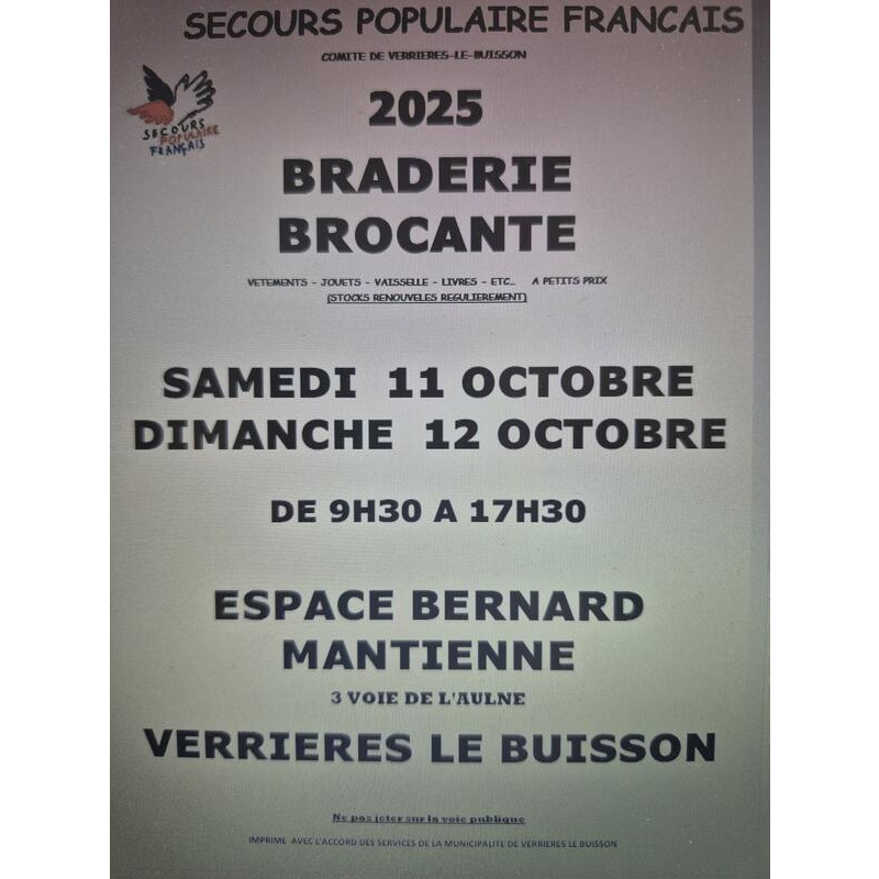 Le secours populaire - comité de verrières-le-buisson - organise une braderie/brocante les 11 et 12 octobre 2025 de 9h30 à 17h30, comprenant des vêtements enfants, femmes, hommes, chaussures, jouets, vaisselle, bibelots, petits electroménagers, livres , cd ,dvd, puériculture, linge de maison ..Etc à petits prix. Les stands sont renouvelés entre le samedi et le dimanche