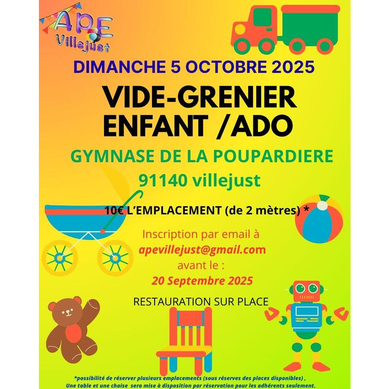 Vide grenier spécial enfance: articles puéricultures, vetements, jouets, livres dans le gymnase de villejust avec accès a des sanitaires possible. Buvette et snacking sur place